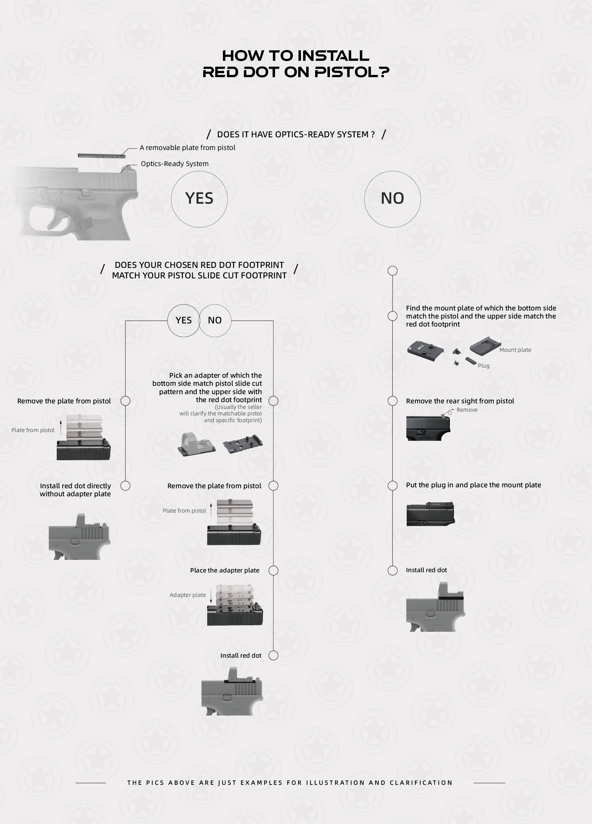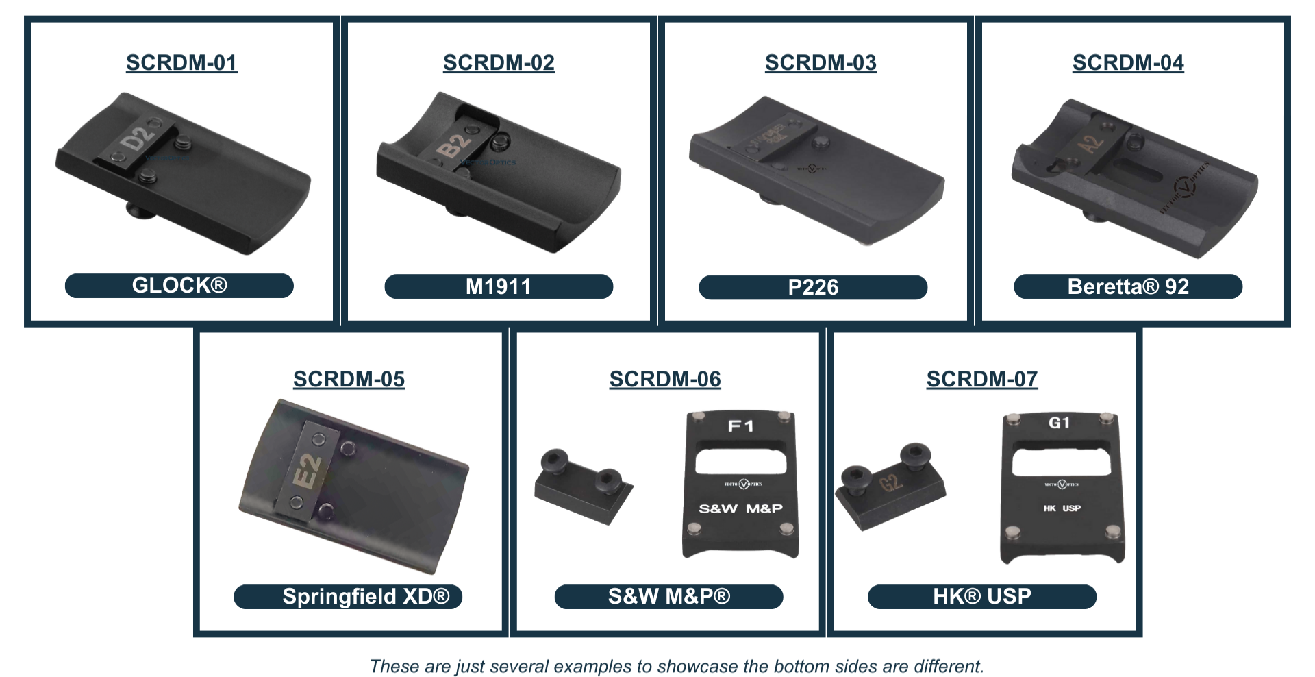Tabanca için plakalar: SCRDM-01 (GLOCK®), SCRDM-02 (M1911), SCRDM-03 (P226), SCRDM-04 (BERETTA® 92), SCRDM-05 (Springfield XD®), SCRDM-06 (S&W M&P®), SCRDM-07 (HK® USP)