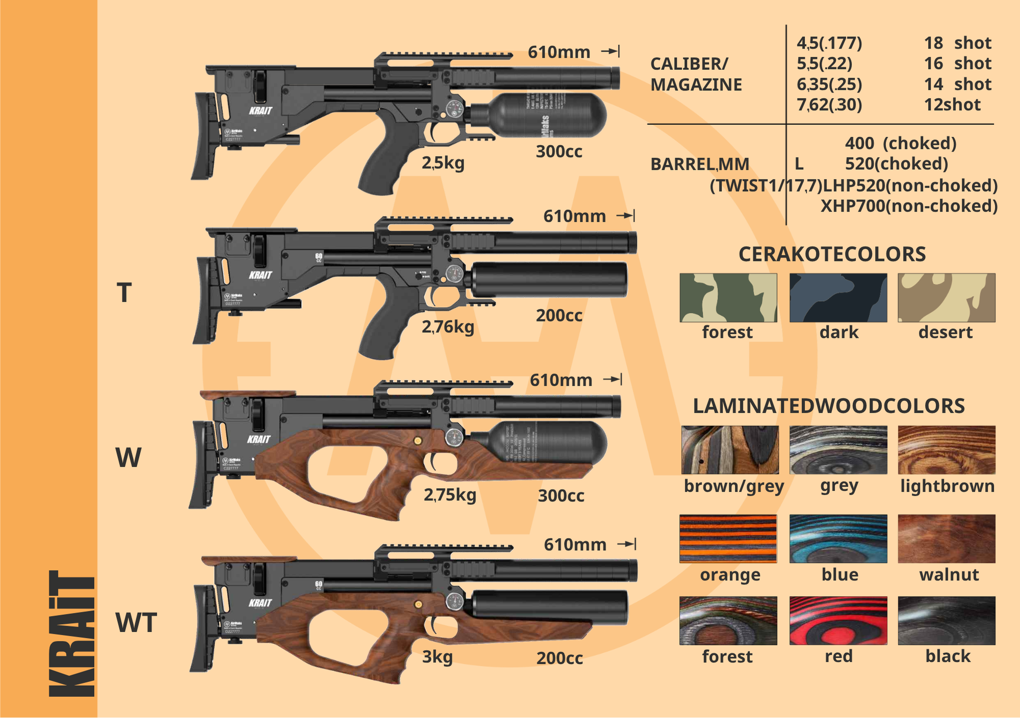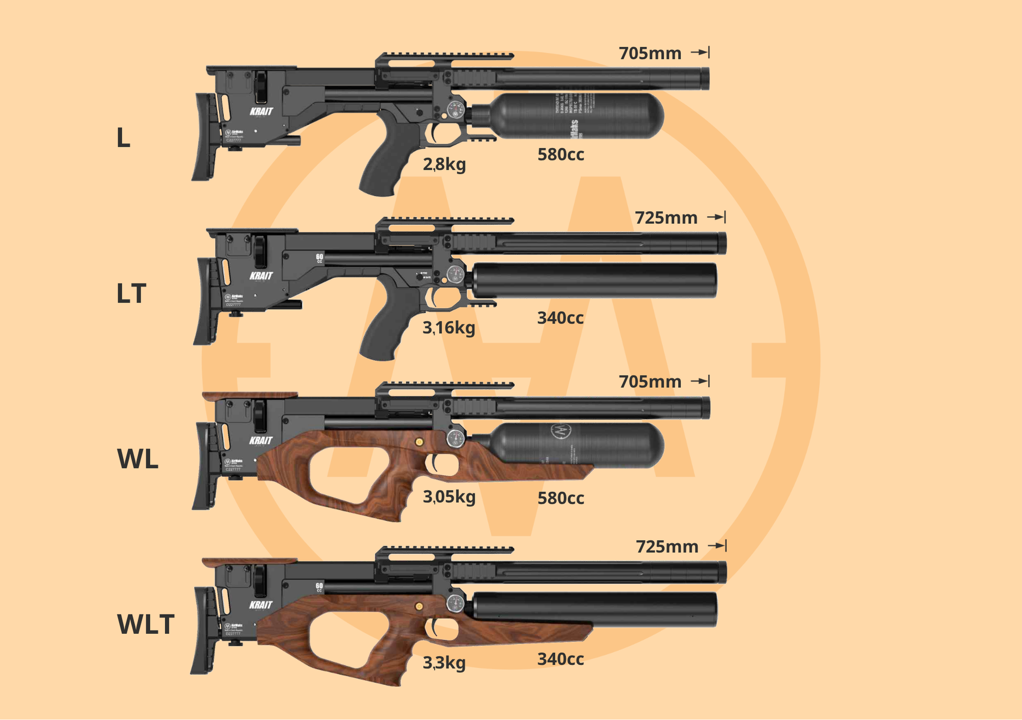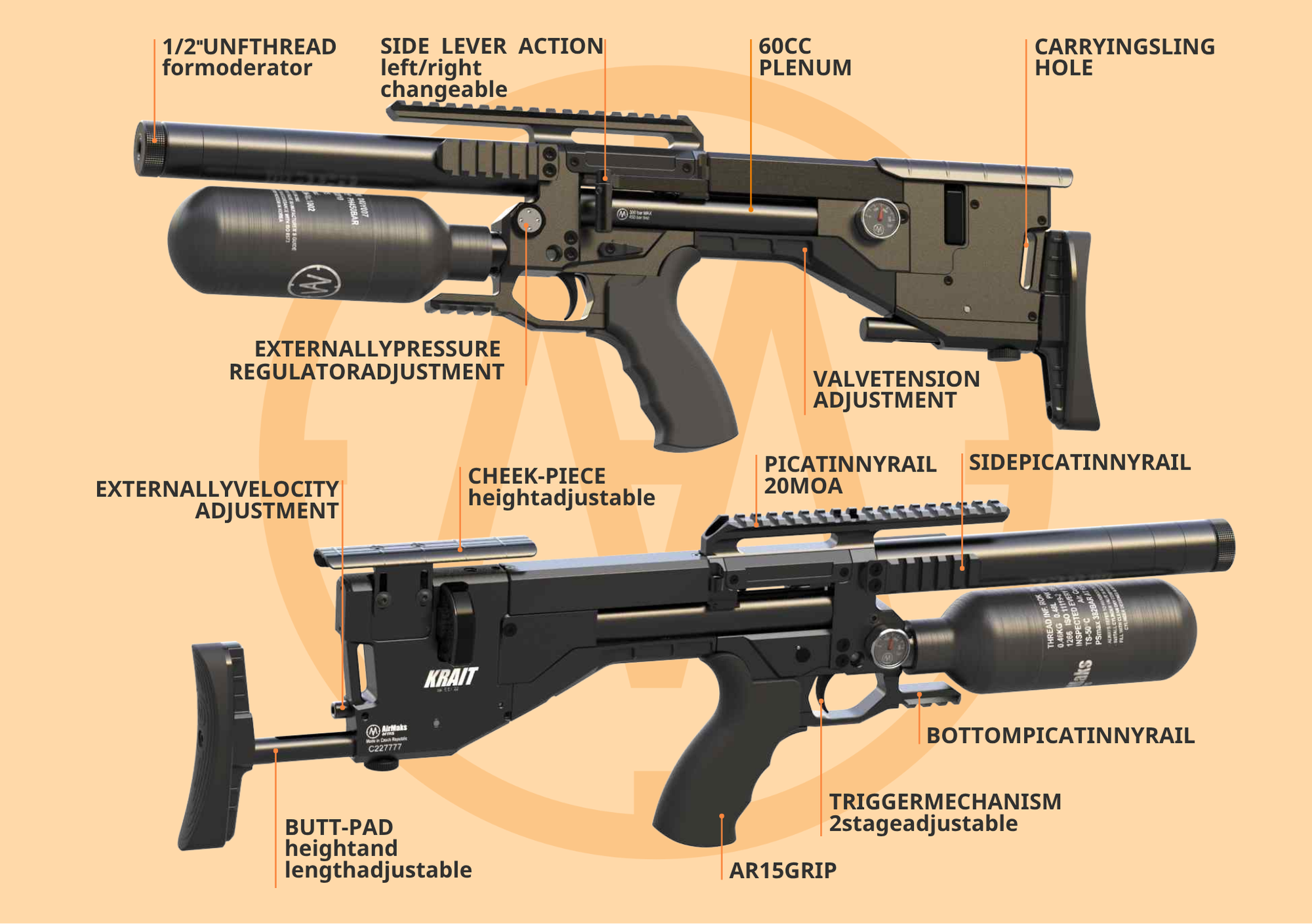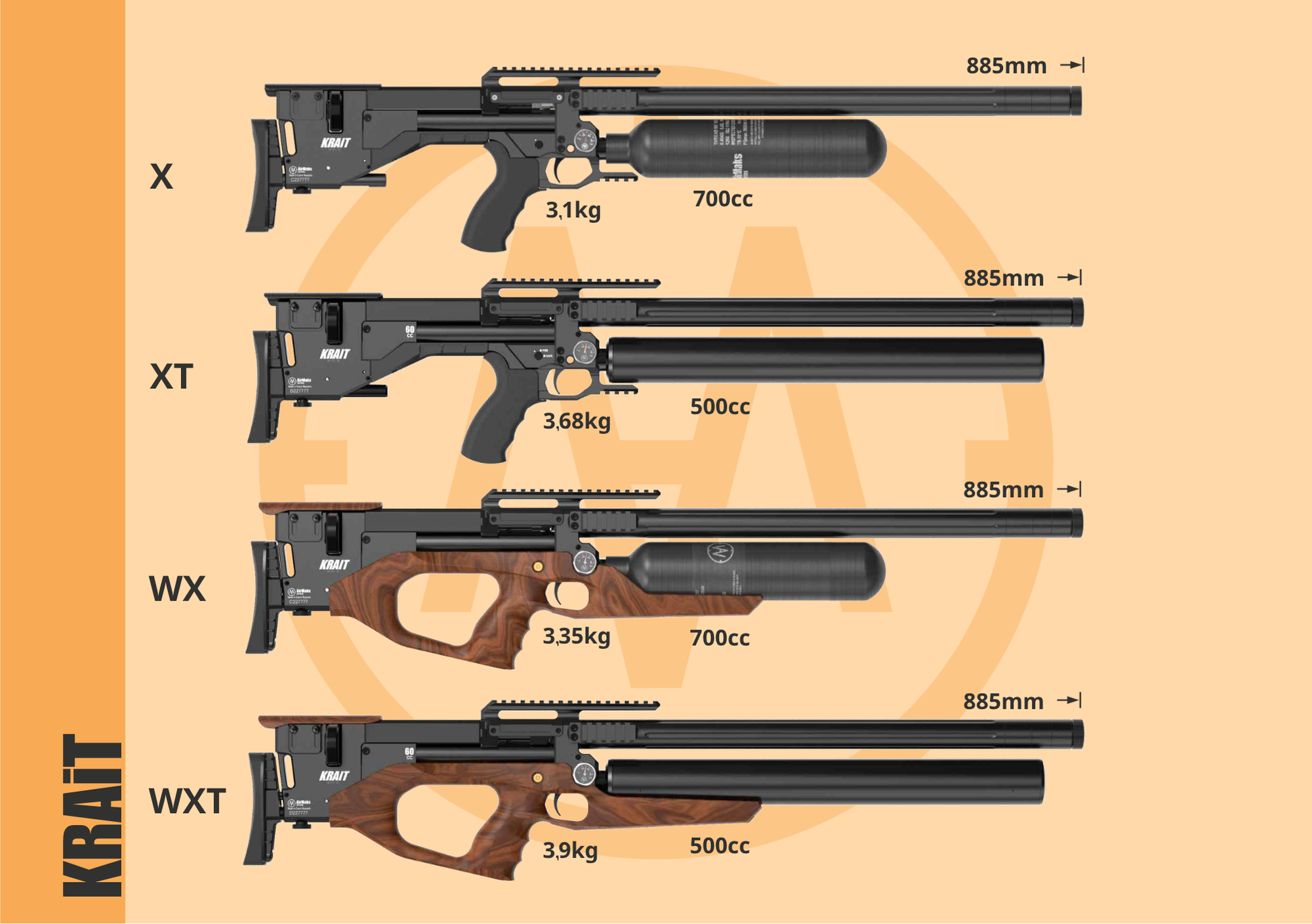 Airmaks Krait X, uzun namlu ve büyük tüp hacmi ile seri içinde en yüksek atış gücü ve menzil başarısını sunar. Dengeli tasarım, ayarlanabilir regülatör ve kapsamlı ergonomik donanımıyla uzun mesafe atışlarında üstün performans sağlar.