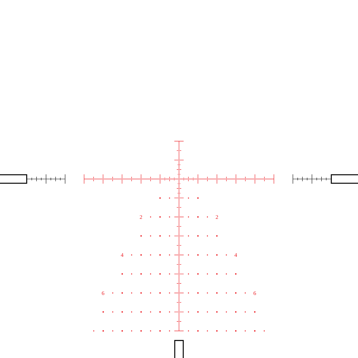 | Mil Pro 20x artıkıl yapısı, 20x büyütmede hassas Mil aralıklarıyla çalışır ve yarım Mil işaretleri ile geniş tutma referansları sunar. Orta bölümde yer alan ek 1/4 Mil nişan noktaları, daha hassas düzeltme gereken atış senaryolarında avantaj sağlar. |