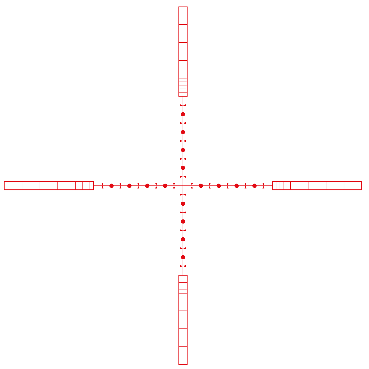 | 10x 1.2 Mil Dot artıkıl, camdan işlenmiş yapısı ve 10x büyütmede hassas mil aralığı ile mesafe tahmini ve düzeltme noktaları açısından daha kontrollü kullanım sunar. Yarım mil aralıklı noktalar, bağlar ve 0,2 mil segmentli içi boş çubuklar sayesinde nişan noktası seçimi daha esnek hâle gelir. |