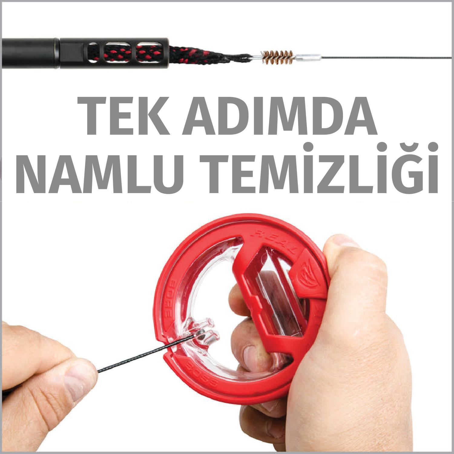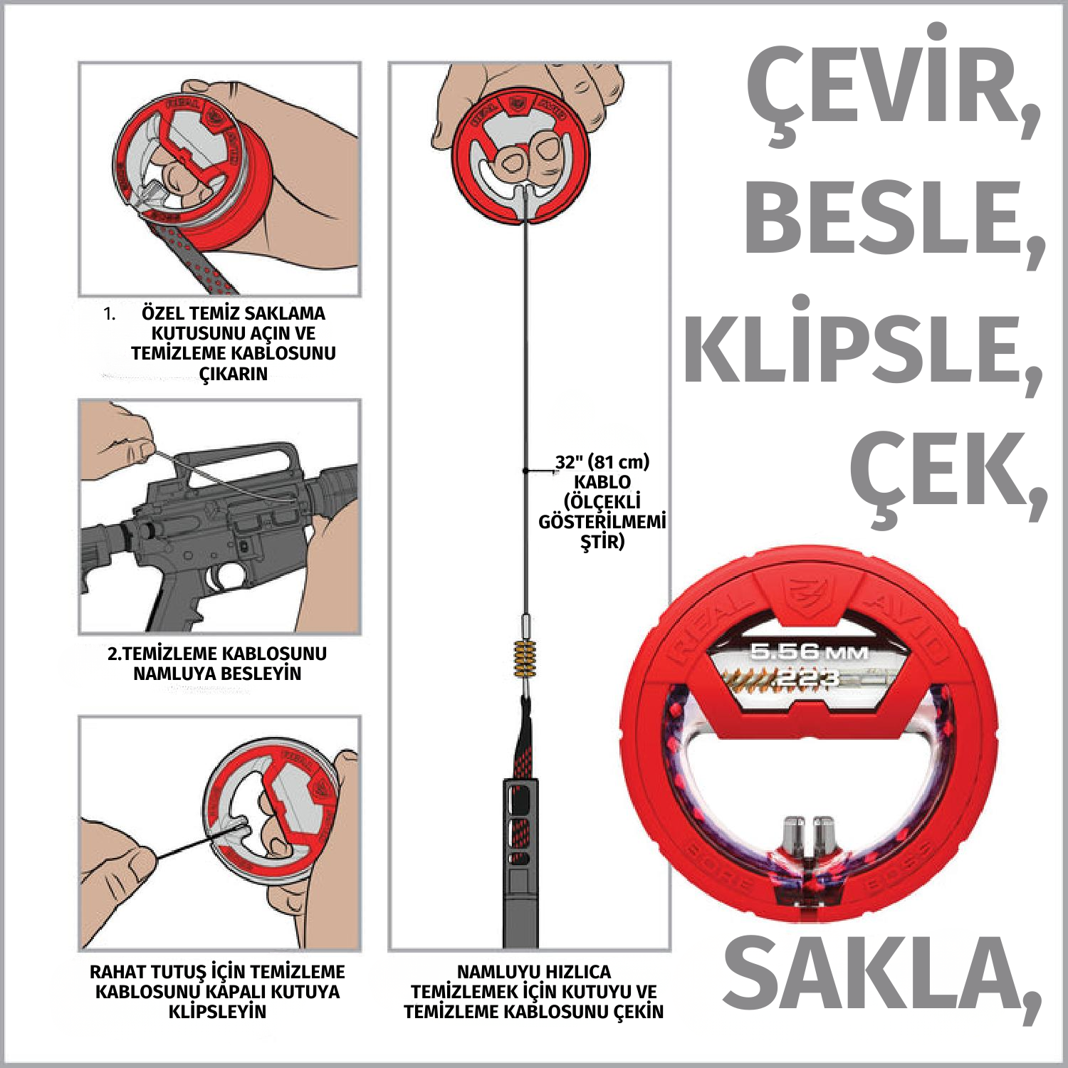 Sadece saklama kutusunu açın, kabloyu namludan geçirin, güvenli tutuş için klipsleyin ve çekerek namluyu kısa sürede temizleyin.