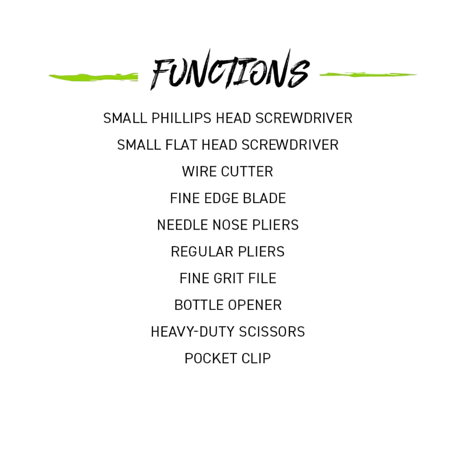 - 9 fonksiyon: pense, tel kesici, düz ve yıldız tornavidalar, bıçak, makas, şişe açacağı, törpü, konserve açacağı