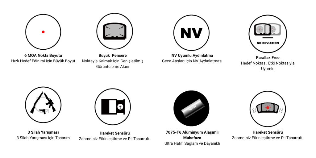 IPX7 su geçirmezlik, 1500G darbe dayanımı ve 7075-T6 alüminyum gövde, bu red dot nişangahı zorlu koşullarda dahi güvenilir hale getirir.